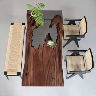Suar Wood:Also known as Rain Tree, crafted from rare Suar Wood slabs and crystal-clear epoxy resin, this statement table showcases nature's artistry. The Peruvian Walnut features dramatic swirling grain patterns in warm chocolate hues, while the aerospace-grade epoxy resin creates durable, glass-like river accents that amplify light refraction. Hand-polished to a museum-quality finish, each piece preserves the wood's organic edges for rustic authenticity paired with modern structural integrity.