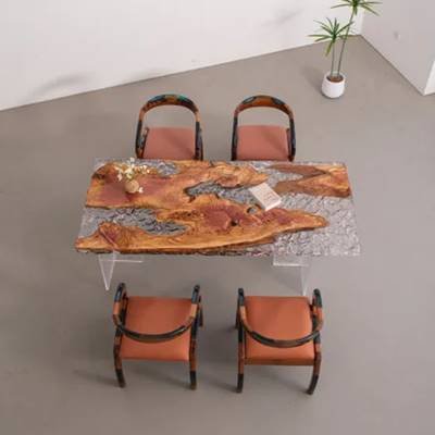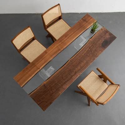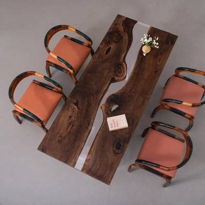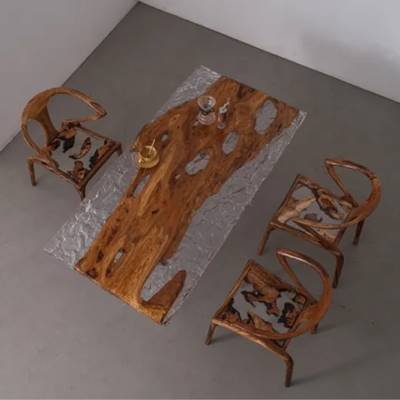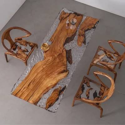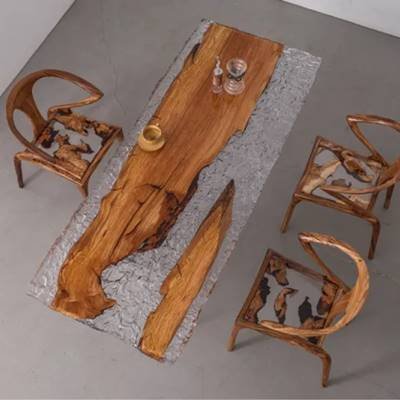 Camphor Wood:This camphor wood and resin live-edge table artfully combines the natural insect-repellent properties of aromatic camphor wood with the modern allure of cured epoxy. The wood's warm amber hues and interlocking grain patterns, enhanced by resin's glossy transparency or subtle tints, create a striking balance of organic texture and contemporary elegance. Resin stabilizes the wood's natural knots while preserving its durability and signature camphor aroma. Handcrafted to perfection, it serves as both a functional surface and a sustainable statement piece for nature-inspired interiors.